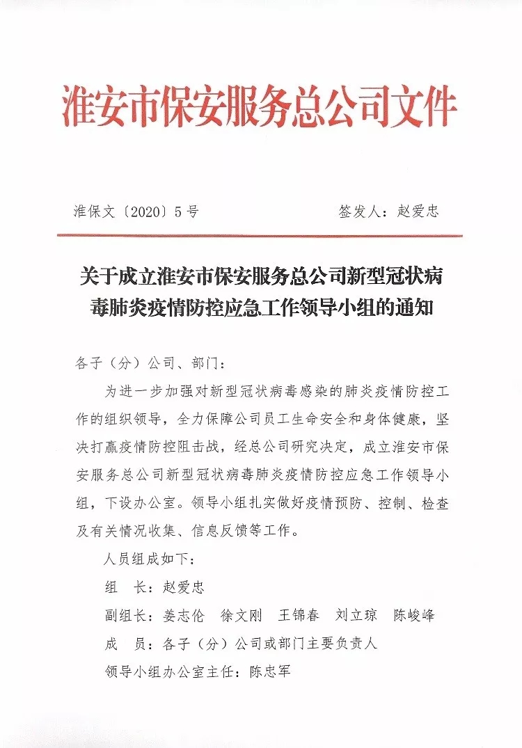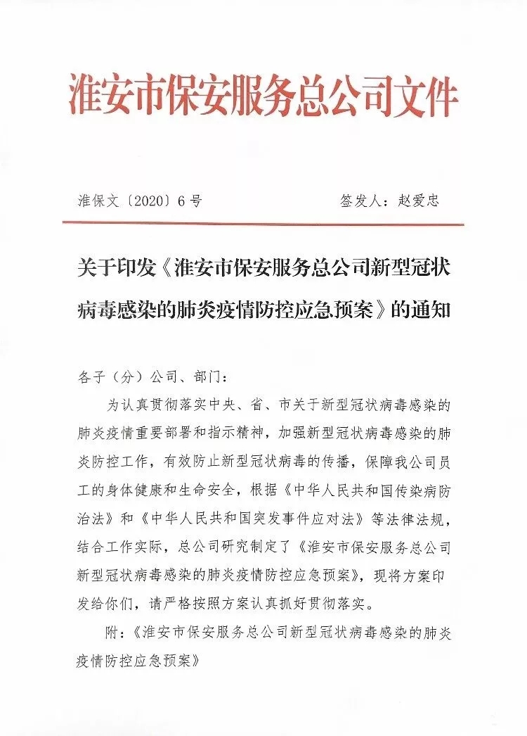 疫情就是命令,防控就是責(zé)任。總公司黨總支積極應(yīng)對(duì),超前部署,1月26日,總公司制定并下發(fā)《淮安市保安服務(wù)總公司新型冠狀病毒感染的肺炎疫情防控應(yīng)急預(yù)案》、《關(guān)于成立新型冠狀病毒感染的肺炎疫情防控應(yīng)急工作領(lǐng)導(dǎo)小組的通知》、《致全體黨員的一封公開信》。春節(jié)期間,總公司黨總支書記、總經(jīng)理趙愛忠等領(lǐng)導(dǎo)班子多次深入基層督導(dǎo)疫情防控工作??偣纠梦⑿湃骸⒐ぷ魅簩?duì)疫情防范工作進(jìn)行再部署、再安排、再要求,要求各級(jí)管理人員要把疫情防控作為當(dāng)前最大的政治任務(wù),切實(shí)履職擔(dān)責(zé),認(rèn)真抓好疫情防控工作,做到全員宣傳到位、措施到位、防范到位。