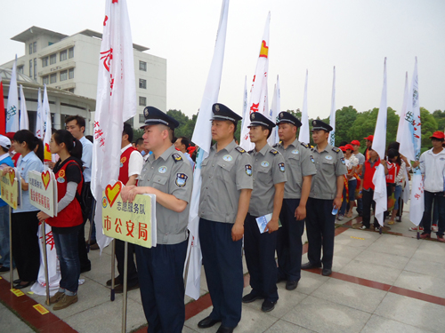 早上8:30左右 , 隊(duì)員們統(tǒng)一制服,帶上隊(duì)旗和隊(duì)牌,在師范學(xué)院王營校區(qū)生物科學(xué)館前廣場(chǎng)前參加環(huán)保知識(shí)的宣傳活動(dòng)。隊(duì)員們紛紛表示,保護(hù)環(huán)境,與我們的生活息息相關(guān),從身邊小事做起,將切實(shí)落實(shí)到保安的實(shí)際工作中去。作為青年志愿者,將呼吁身邊更多的人用實(shí)際行動(dòng),共同為保護(hù)洪澤湖、保護(hù)環(huán)境而盡心盡力,為努力營造一個(gè)優(yōu)美的人居環(huán)境而努力。