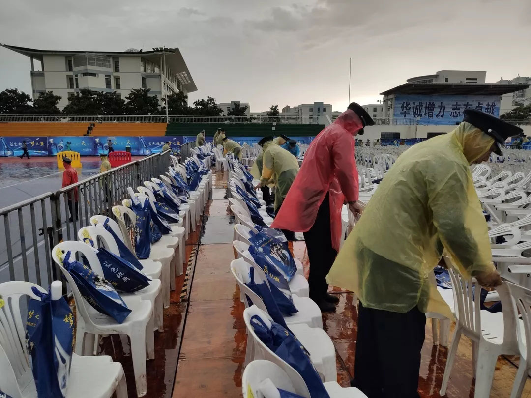 7月6日下午15點,晚會現(xiàn)場暴雨來臨,降雨量已超100毫米,雨勢持續(xù),并伴有雷暴天氣。由于惡劣天氣影響,加上持續(xù)暴雨,部分道路積水嚴重,給觀眾入場帶來安全隱患??偣玖⒓磫訛暮μ鞖鈶鳖A案,行政部門迅速出動,發(fā)放雨衣。人防管理中心組織全體保安隊員,在重要路口指揮疏導,采取定人、定崗、定責的預防措施,全體保安隊員在暴雨中堅守崗位,認真做好崗位工作。