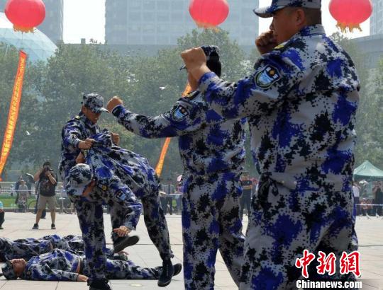 身著作訓(xùn)服的特種保安現(xiàn)場(chǎng)表演格斗功夫。翟羽佳攝