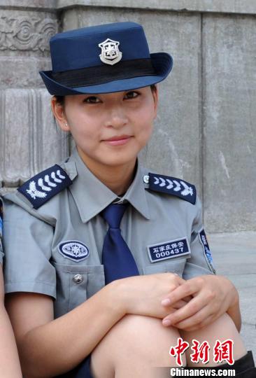 當(dāng)天演練活動(dòng)中,一位身著新式保安服的女保安在一旁休息。翟羽佳攝