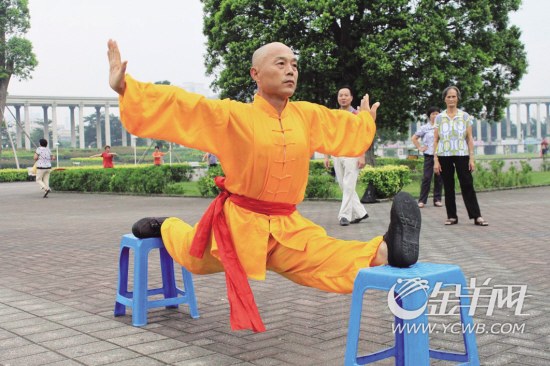 “農(nóng)民工組合”中的武者張中心來自河南孟州,體魄結(jié)實(shí),剃著光頭,頗有點(diǎn)少林寺武僧的范兒。張中心告訴記者,自己出生在有著“武術(shù)之鄉(xiāng)”之稱的孟州化工鎮(zhèn),從小就對武術(shù)癡迷。與王文正一樣,張中心同樣從小家境貧寒,早年父親得了精神病,家里沒了頂梁柱,張中心也是小學(xué)沒畢業(yè)便輟學(xué)了,兄妹三人都是母親一人拉扯大。由于父親精神病發(fā)作,出去惹了不少事,遭到了鄰居的不解和謾罵,兄妹幾個(gè)也常被欺負(fù),于是張中心暗下決心,學(xué)好武術(shù),保護(hù)家人不被欺負(fù)。說到這,張中心覺得自己走上習(xí)武之路的初衷有些偏頗,“習(xí)武之人不可為一己之私,以怨報(bào)怨,有違武術(shù)之道,所以現(xiàn)在打算免費(fèi)傳授一些武術(shù)給大家,當(dāng)做健身之道。”