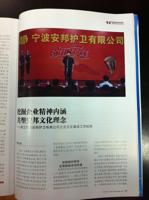 2012年,寧波安邦護(hù)衛(wèi)有限公司通過開設(shè)“建設(shè)優(yōu)秀的企業(yè)文化”專題講座、刊發(fā)“企業(yè)文化建設(shè)專輯”、組織安邦文化核心價(jià)值觀討論、征集企業(yè)名片(口號(hào))、舉辦隊(duì)列會(huì)操和演講比賽等活動(dòng),著力推進(jìn)企業(yè)文化建設(shè),顯著提升公司軟實(shí)力、核心競爭力和員工整體素質(zhì),取得了一定成效。2013年1月,今年第1期《中國保安》(總第279期)雜志 “保安企業(yè)文化”專題欄目刊登《挖掘企業(yè)精神內(nèi)涵,共塑安邦文化理念——浙江寧波安邦護(hù)衛(wèi)有限公司企業(yè)文化建設(shè)工作紀(jì)實(shí)》,對寧波安邦護(hù)衛(wèi)有限公司企業(yè)文化建設(shè)情況進(jìn)行了報(bào)道,進(jìn)一步擴(kuò)大了公司的行業(yè)知名度和社會(huì)影響力。