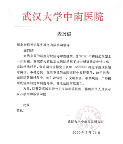近日,廣電運(yùn)通下屬成員企業(yè)湖北融信收到了一封來自武漢大學(xué)中南醫(yī)院的表揚(yáng)信,信中對(duì)湖北融信中南醫(yī)院服務(wù)車組在疫情期間堅(jiān)守崗位、不畏恐懼、敢于擔(dān)當(dāng)、文明服務(wù)的工作表現(xiàn)給予了充分肯定與表揚(yáng),并對(duì)湖北融信給予醫(yī)院抗疫工作的支持與幫助表示衷心感謝。