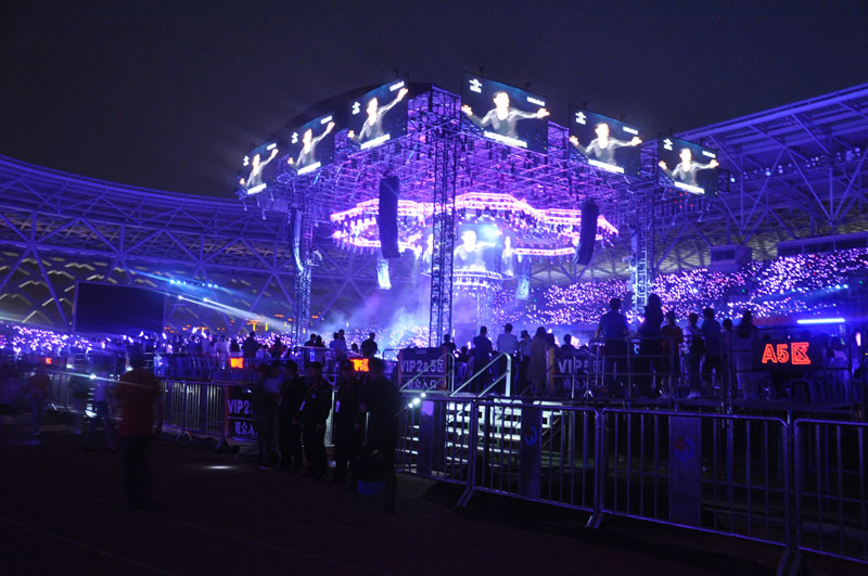 5月5日,“A CLASSIC TOUR學(xué)友·經(jīng)典世界演唱會”揚州站,以人防中心王錦春總監(jiān)為領(lǐng)導(dǎo)管理班子,積極與主辦方聯(lián)絡(luò),在演唱會前一天,組織精干管理人員踏勘現(xiàn)場,提出合理化安保建議,精心組織崗位分配,各項前期準(zhǔn)備工作有條不紊地開展。5日上午10時,第一批100名大型活動特勤安保隊伍進(jìn)駐揚州體育公園,下午16時,100名專業(yè)安檢員和特勤隊員準(zhǔn)時到達(dá)各預(yù)定崗位開展工作。在整場演唱會活動中,安檢崗位中查獲各類違禁品5000余件。因主辦方設(shè)定預(yù)檢票口位置較少,造成大量觀眾聚集,我們合理調(diào)集機(jī)動隊伍認(rèn)真做好人員疏散工作,避免了事故隱患。
