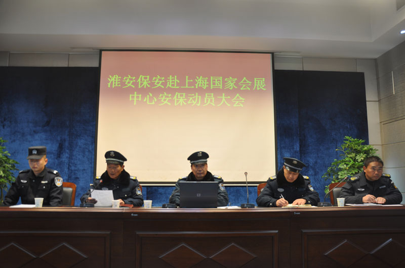 2017年12月7日下午14:30,淮安保安精選出的150名特勤隊員在總公司會議室參加赴國展中心安保動員大會,人防中心王錦春總監(jiān)代表總公司在主席團發(fā)表動員令,此次項目帶隊領導大隊長孫茂林等在主席臺就坐。