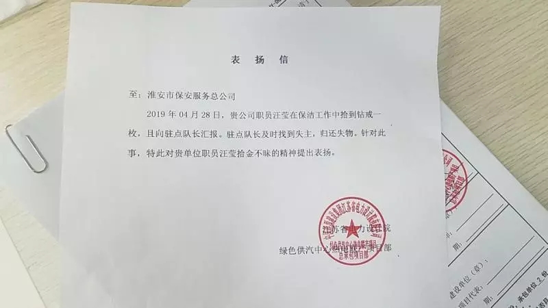 2019年5月1日,駐外分公司收到來自中國能源建設(shè)集團(tuán)江蘇省電力設(shè)計(jì)院有限公司發(fā)來的表揚(yáng)信,感謝淮安保安駐江蘇省電力設(shè)計(jì)院有限公司隊(duì)員汪瑩在4月28日的保潔工作中拾金不昧,撿到鉆戒后立即向隊(duì)長(zhǎng)匯報(bào),駐點(diǎn)隊(duì)長(zhǎng)及時(shí)通報(bào)客戶單位并采取相應(yīng)措施聯(lián)系到失主,歸還失物。失主非常感謝汪瑩,客戶單位對(duì)淮安保安派駐的保潔員汪瑩同志拾金不昧的精神提出了表揚(yáng),對(duì)淮安保安進(jìn)駐后的工作也表示認(rèn)可!