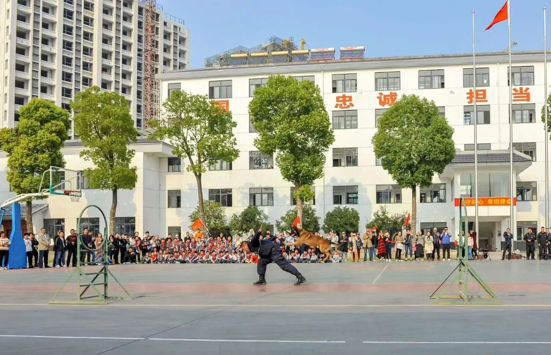 在警犬訓(xùn)練基地,訓(xùn)導(dǎo)員向?qū)W生們講解了警犬在搜救工作中發(fā)揮的重要作用。隨后精彩的警犬訓(xùn)練表演把活動(dòng)推向了高潮:警犬在訓(xùn)導(dǎo)員的口令下,迅速準(zhǔn)確地做出相應(yīng)的基本動(dòng)作和匍匐、后退、站立、跳躍等花式動(dòng)作,還模擬了犯罪嫌疑人劫持人質(zhì),隊(duì)員果斷給警犬下達(dá)口令,接到口令的警犬猶如出膛的子彈,瞄準(zhǔn)該男子的右手飛撲著咬去,當(dāng)場(chǎng)控制了“犯罪分子”,解救了人質(zhì)。在場(chǎng)學(xué)生目不轉(zhuǎn)睛、連連歡呼。